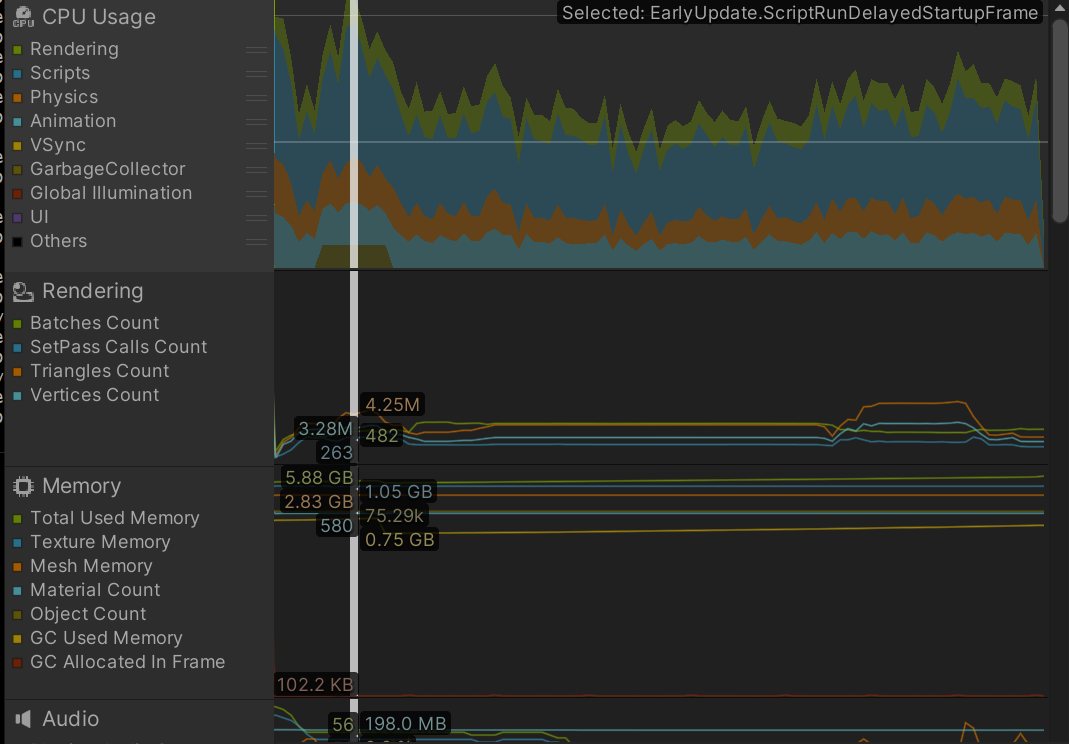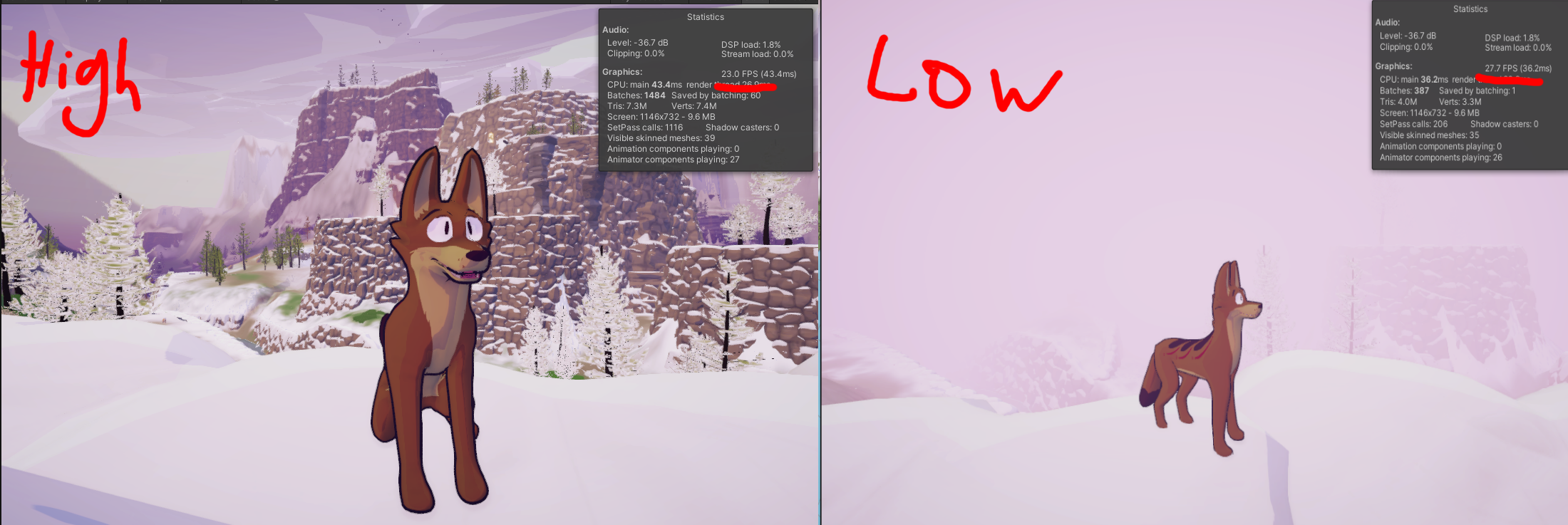 I worked on this really cool game called Starshifter and release updates for it intermittently. I got a few complaints about performance recently, so I decided to look at that tonight. I did test the game on some mid/low end hardware before I released it and didn't have any issues. So let's revisit things! After waiting 10000 years on version control, and another 10000 for Unity to open the game (I miss godot already) I loaded up the Mountain (the last level of the game and the biggest I think?) and got some data with graphics settings set to high and low.