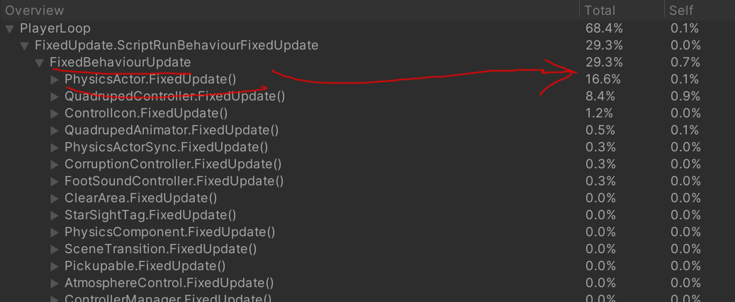 Looks like "PhysicsActor.FixedUpdate()" is pretty expensive! Well, ~20% of the CPU time, which makes me worry that something else is also going wrong with the NPCs. Anyway! Turns out we are using a fancy character controller, called the lightbug character controller, and this is from that controller's physics step. Reducing the physics step rate is not something I want to do to a game that's been out for 2 years. I can try to disable continuous collision detection, I could also disable the physicsactor if the player is reasonably far away enough and/or not looking at the NPC. This custom character controller is probably overkill for many of the NPC's as well, several of them just roam around in a specific area and don't interact with anything. Not sure if I want to go to the trouble of removing the character controller to roll my own simpler one though.
